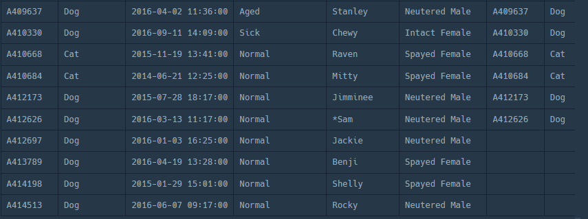 | ANIMAL_ID | ANIMAL_TYPE | DATETIME | NAME | SEX_UPON_OUTCOME |