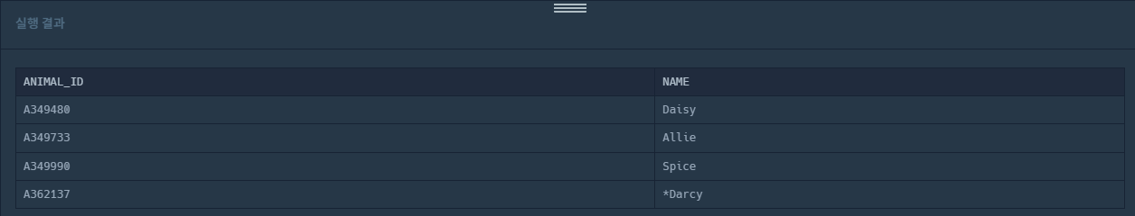 | ANIMAL_ID | NAME |