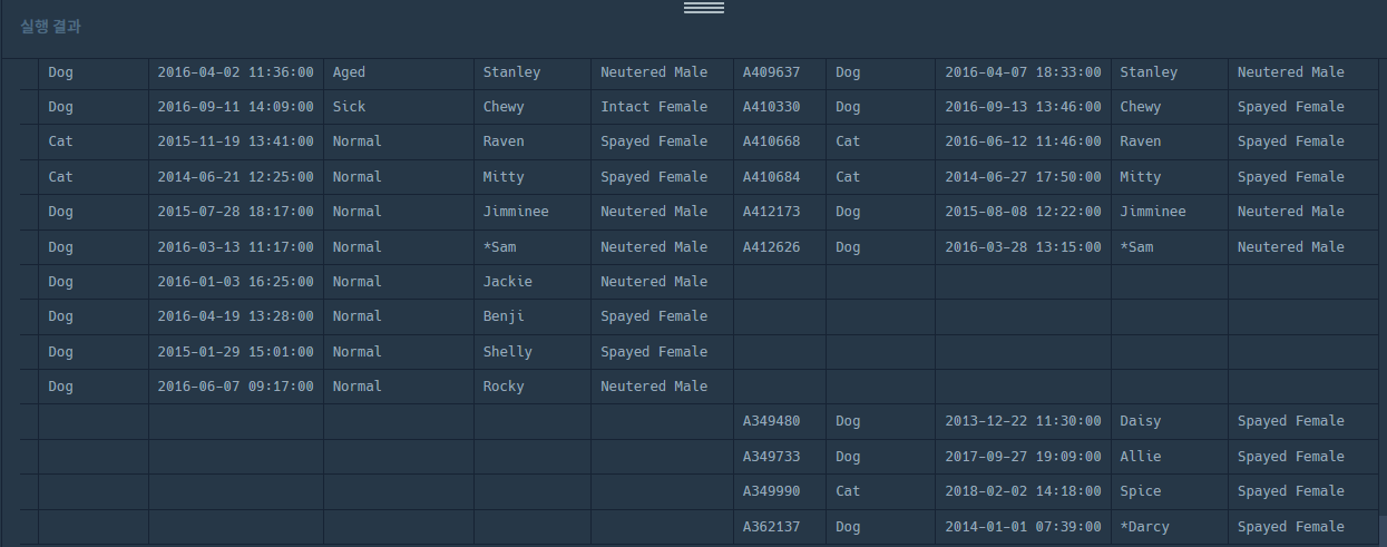 왼쪽이 ANIMAL_INS의 데이터, 오른쪽이 ANIMAL_OUTS의 데이터 이다. 손실된 데이터는 밑에서 4번째인 데이터가 된다.