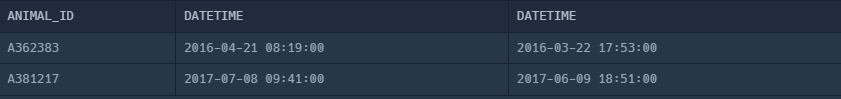 | ANIMAL_ID | ANIMAL_TYPE | DATETIME | NAME | SEX_UPON_OUTCOME |